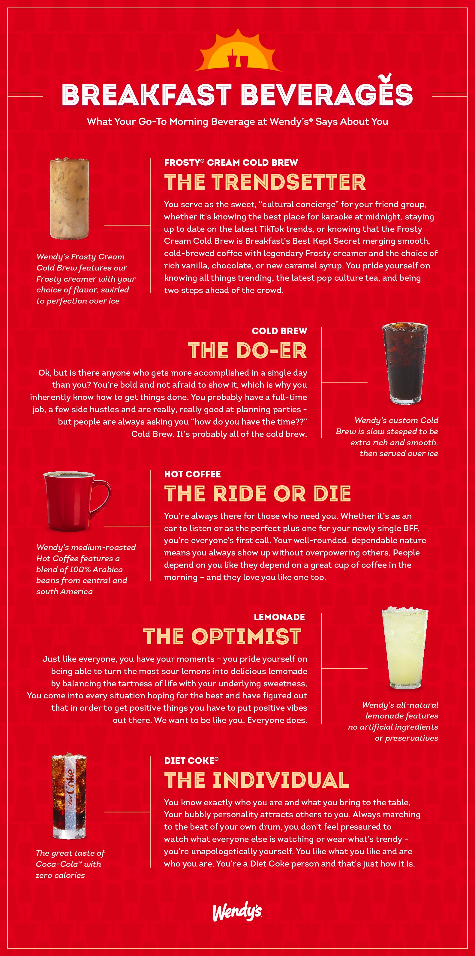 - Coca-Cola®, Coca-Cola Zero Sugar & Diet Coke®: The cold, refreshing, sparkling classic that completes a morning meal. If these sips aren’t your speed, try hundreds of different flavor combinations, including waters, sports drinks, lemonades, teas, juices and sparkling beverages on Coca-Cola Freestyle® dispensers at your local Wendy’s.